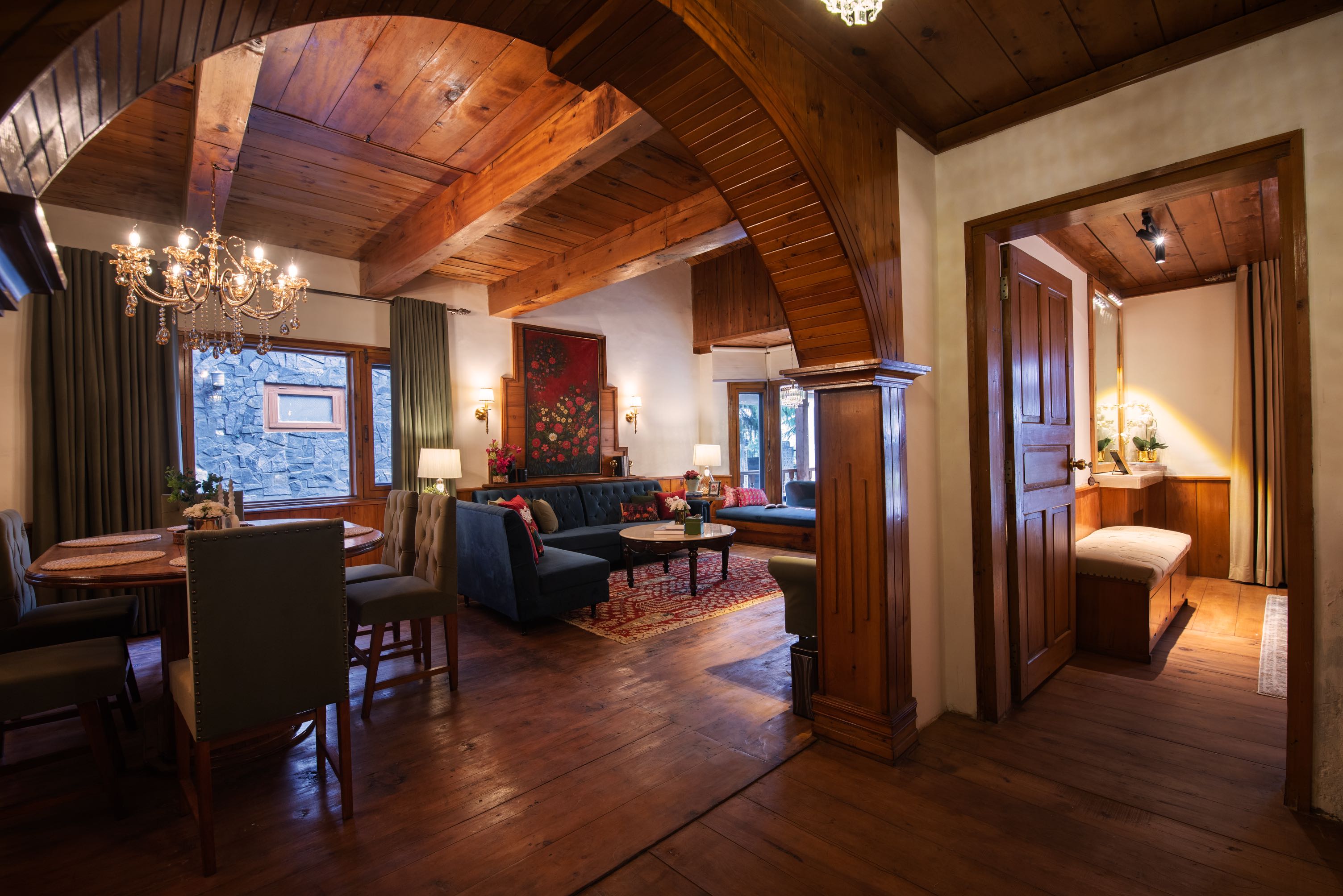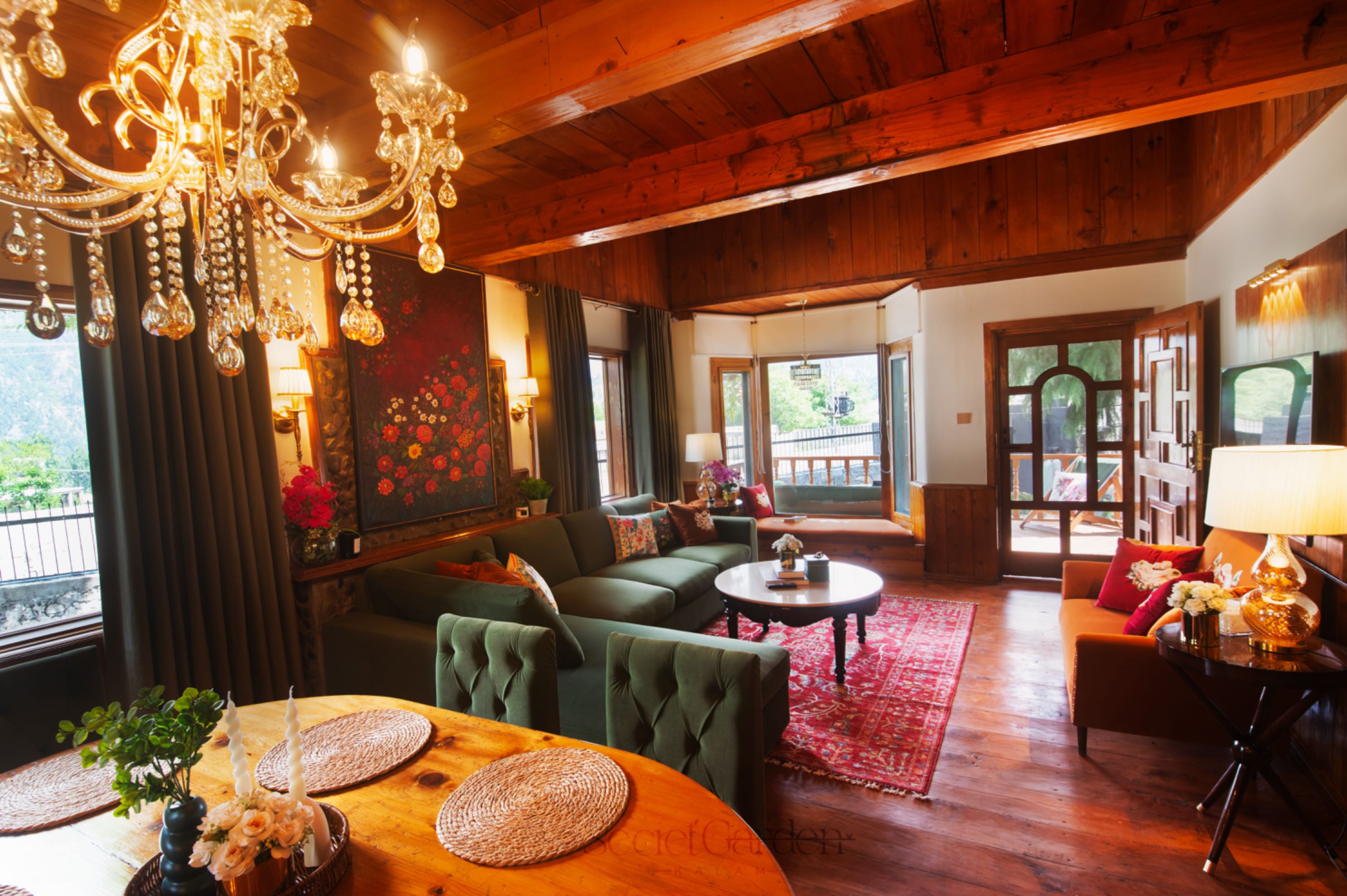 A beautifully furnished English-style cottage with rustic décor, terrace views and lush gardens. Includes 3 lovely bedrooms, 2 elegant bathrooms, spacious living areas, a full kitchen on premises offering a curated menu, and complimentary breakfast. Perfect for families and upscale guests seeking a luxury mountain escape in Kalam.